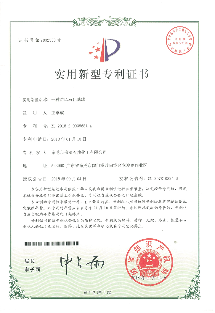 實用新型防風石化儲罐專利證書Click for larger image