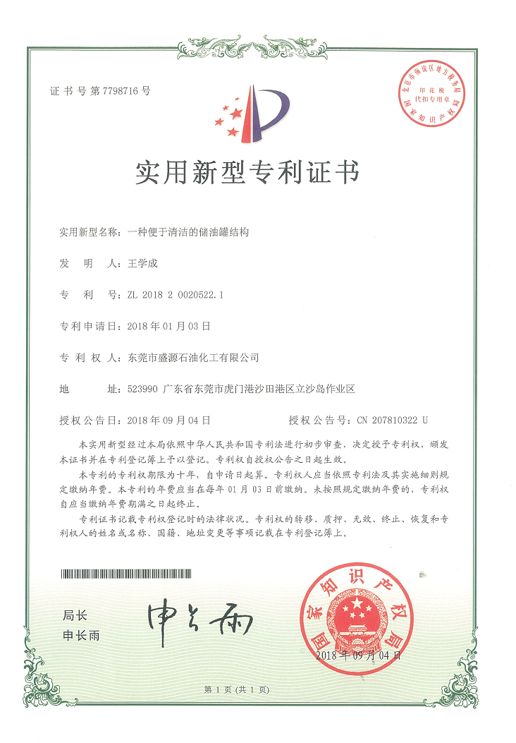 實用新型油罐結構專利證書Click for larger image