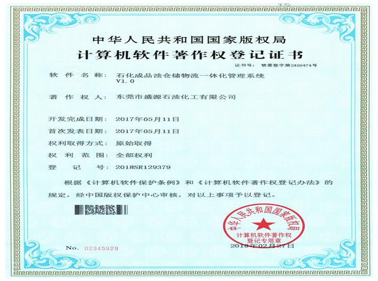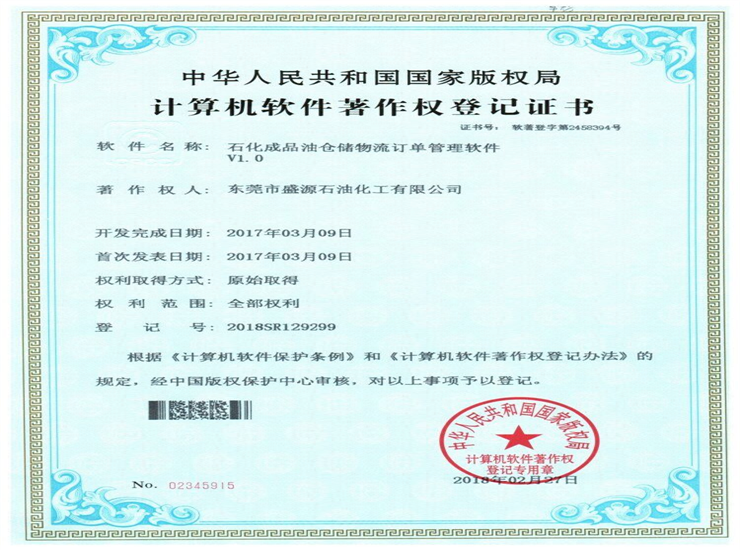 石化倉儲物流一體化管理系統著作權登記證書Click for larger image