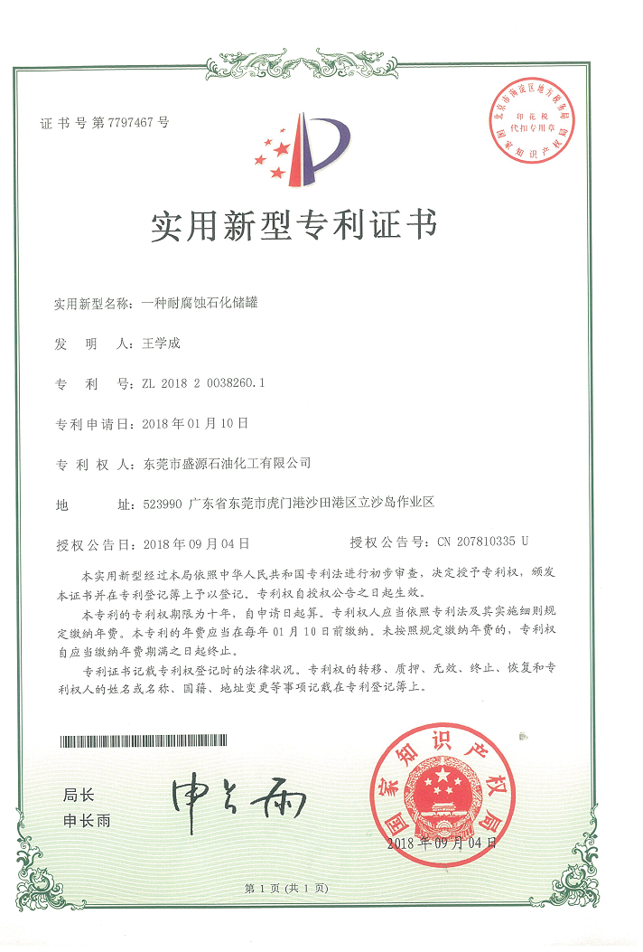 實(shí)用新型耐腐蝕儲(chǔ)罐專(zhuān)利證書(shū)Click for larger image