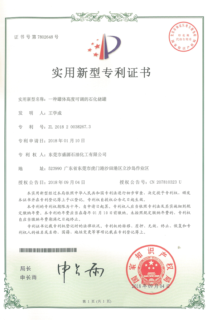 實用新型耐腐蝕儲罐專利證書Click for larger image